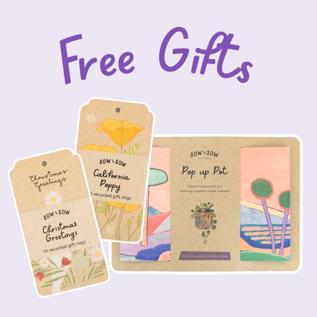 We’re offering a free Pop Up Pot and 2 packs of 10 recycled Gift Tags absolutely FREE! These will magically appear in your cart when you have $120 worth of goodies.
