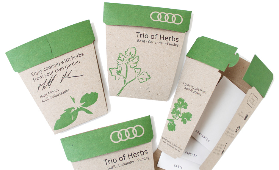 A growing gift from Audi Australia. These custom designed seed packets were made for Audi Hamilton Island Race Week. A ‘Trio of Herbs’ was gifted to each guest at the ‘Chiswick’ dinner presented by Matt Moran on Saturday the 17th of August.