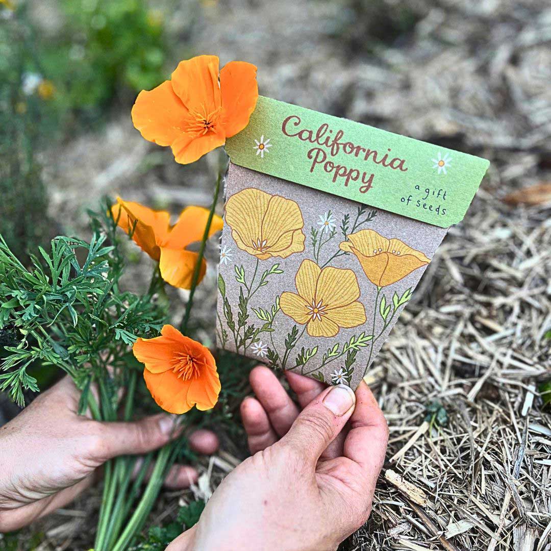 Each Gift of Seeds is a greeting card and gift in one, featuring vibrant botanical illustrations and a packet of easy to grow California Poppy seeds.
