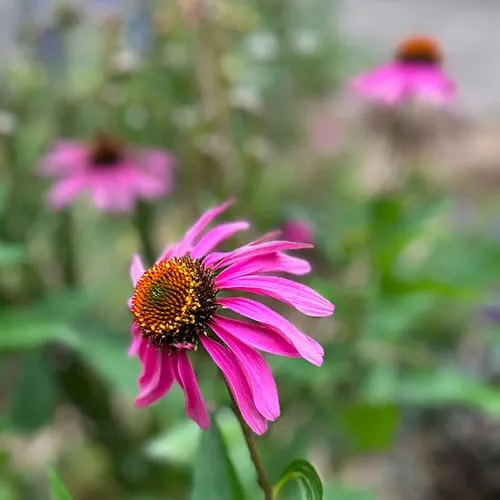 Echinacea purpurea, also known as the ‘Coneflower’ for its striking central cone, is a vibrant cottage and herb garden flower with vibrant purple and pink hues.