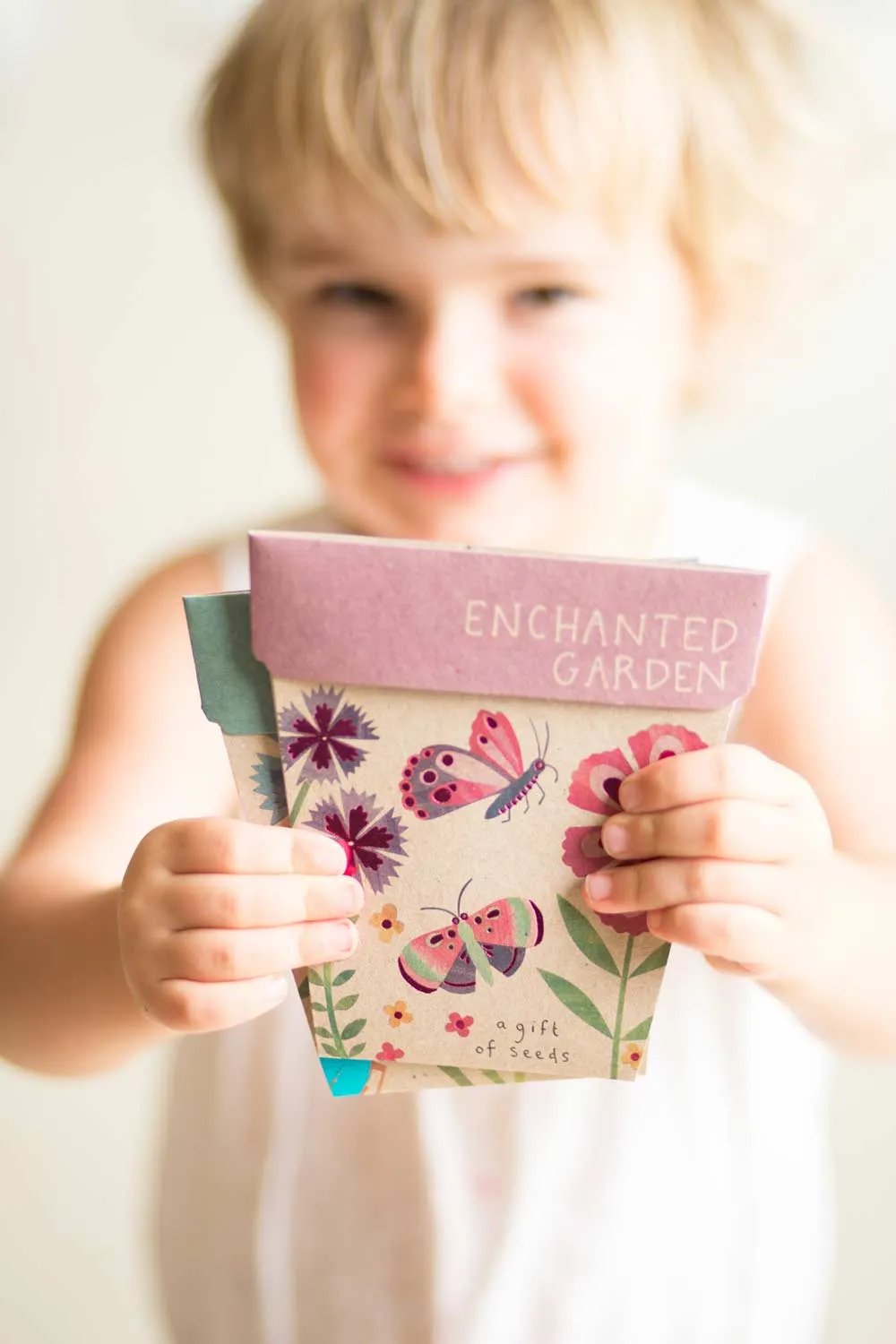 Create an enchanted flower garden that will capture the imagination of the child in us all with this Gift of Seeds. This delightful mix of flower seeds attracts beautiful butterflies and bees and will brighten any pot or garden patch. A mix of dianthus, cosmos, cornflower and alyssum, all are easy to grow and are garden favourites for young and old. Simply scatter seeds, cover with a thin layer of soil and keep moist. These quick growing seeds will pop up in a few days and delight any nature lover. A gift and a card in one, this Gift of Seeds is embellished with stunning illustrations created by Daniella Germain and is printed on 100% post consumer waste recycled card.