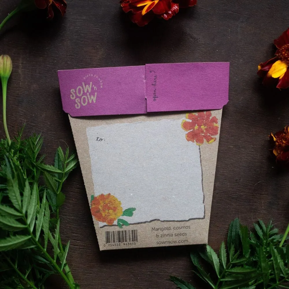 Inside the Gift of Seeds packet is a separate seed sachet containing a cheerful mix of cosmos, zinnia, and marigold seeds. Bright, easy-to-grow and quick-to-flower blooms that bring colour, life, and joy to any garden or pot.
