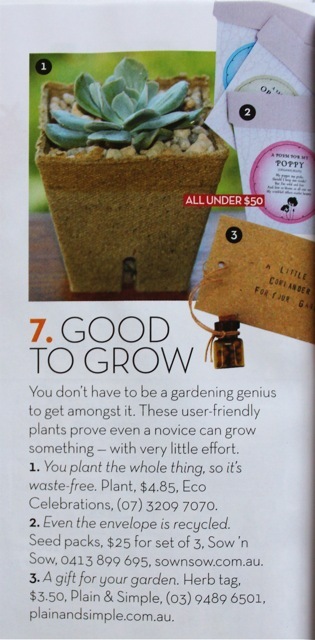 Sow ‘n Sow has a little mention in the July edition of Shop Til You Drop magazine! And what a small world it is, we are on the same page as Foxes of Fancy’s Tex and Joe vegetable bags! We are a part of the ‘Green House’ feature – all things earth-friendly for tree huggers, yay!
